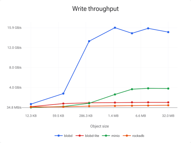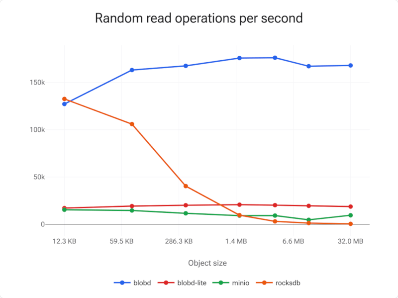 Extremely fast object storage, performing at raw device speeds. Achieves constant sub-millisecond latency random partial reads over objects regardless of size.