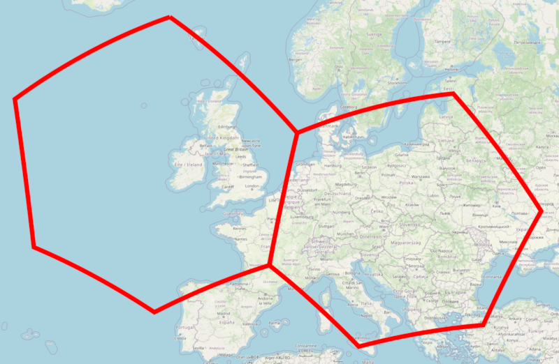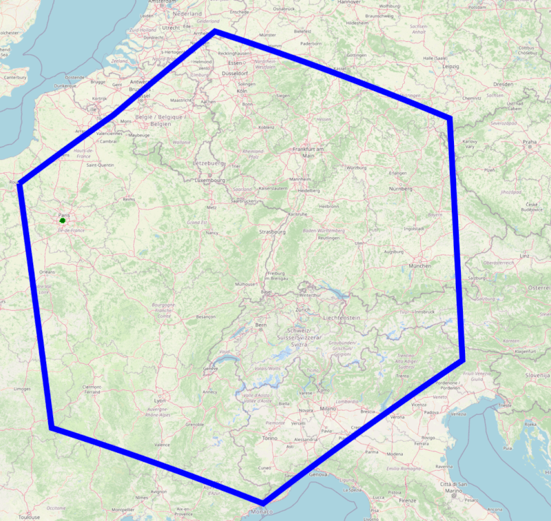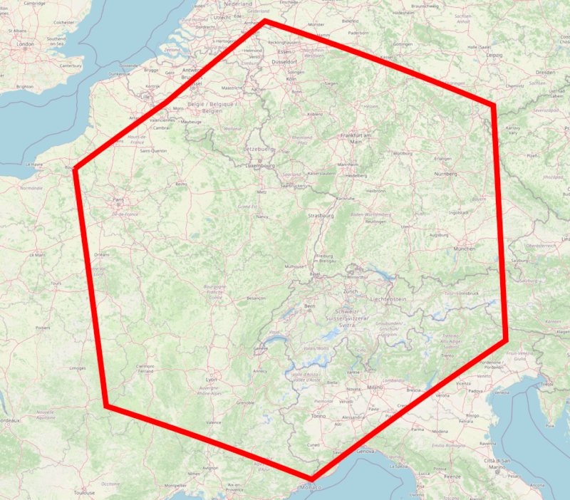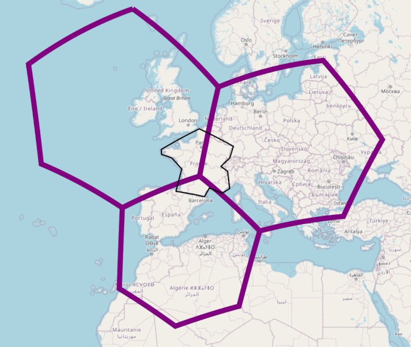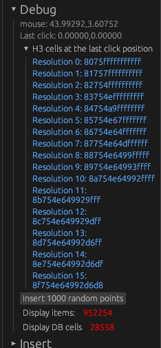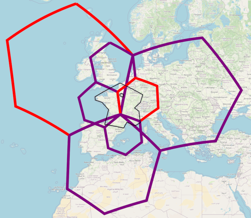On this last step, you can clearly see we didn't cheat and try to cover the whole shape at this res, this would generate approximately 1129 new cells to look up in the database. Instead, we only looked at the 17 children of the blue cell. The red ones were not part of our shape and have been ignored |