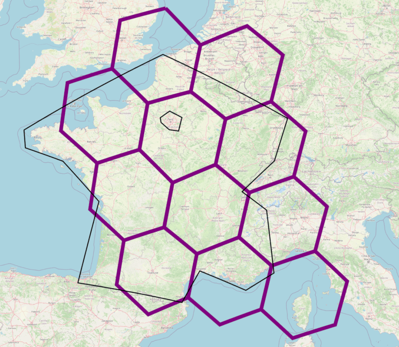 At res 1, though, you should notice I lied to you above. Instead of retrieving all the children of the current cell, we prefer to cover our shape at res+1 when the cells are way larger than our shape |