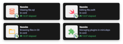 { 'vyfor/cord.nvim', ---@type CordConfig opts = { -- ... } }