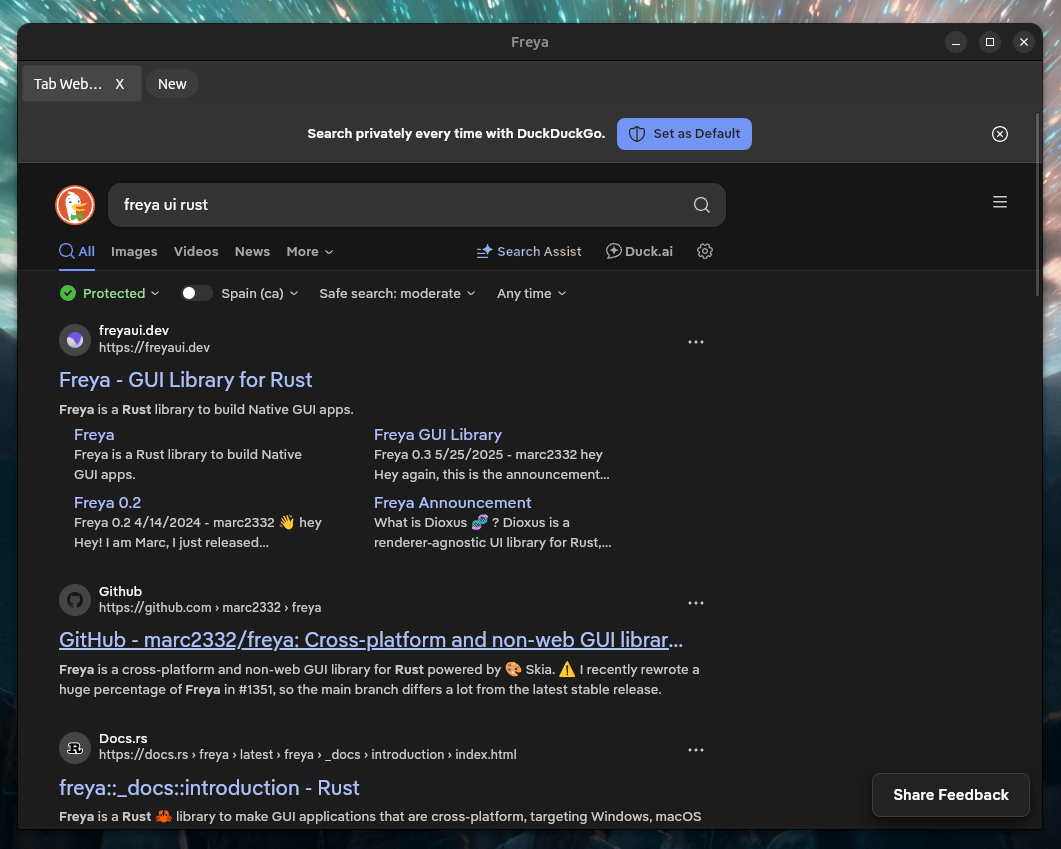 Integrate web content into your native applications with Freya's WebView support. Embed web applications, or simply display web-based content alongside your native UI components.