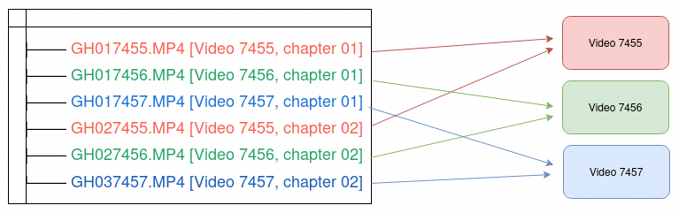 I shoot a lot of long-form videos on my GoPro. Any video longer than a few minutes gets split into multiple files. These are unpleasant to deal with when it's time to edit -- it's tedious and time-consuming to reassemble them. Here's an example of the output structure for multiple long videos: