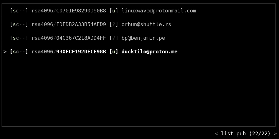 Available keys in the keyring are listed on a table as default. They can be scrolled or the listing type (public/secret keys) can be changed by changing the tab via arrow keys.