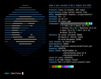 Onefetch can be customized via command-line options to display exactly what you want, the way you want it: adjust the text styling, disable info lines, ignore files and directories, output in multiple formats (JSON, YAML), etc.