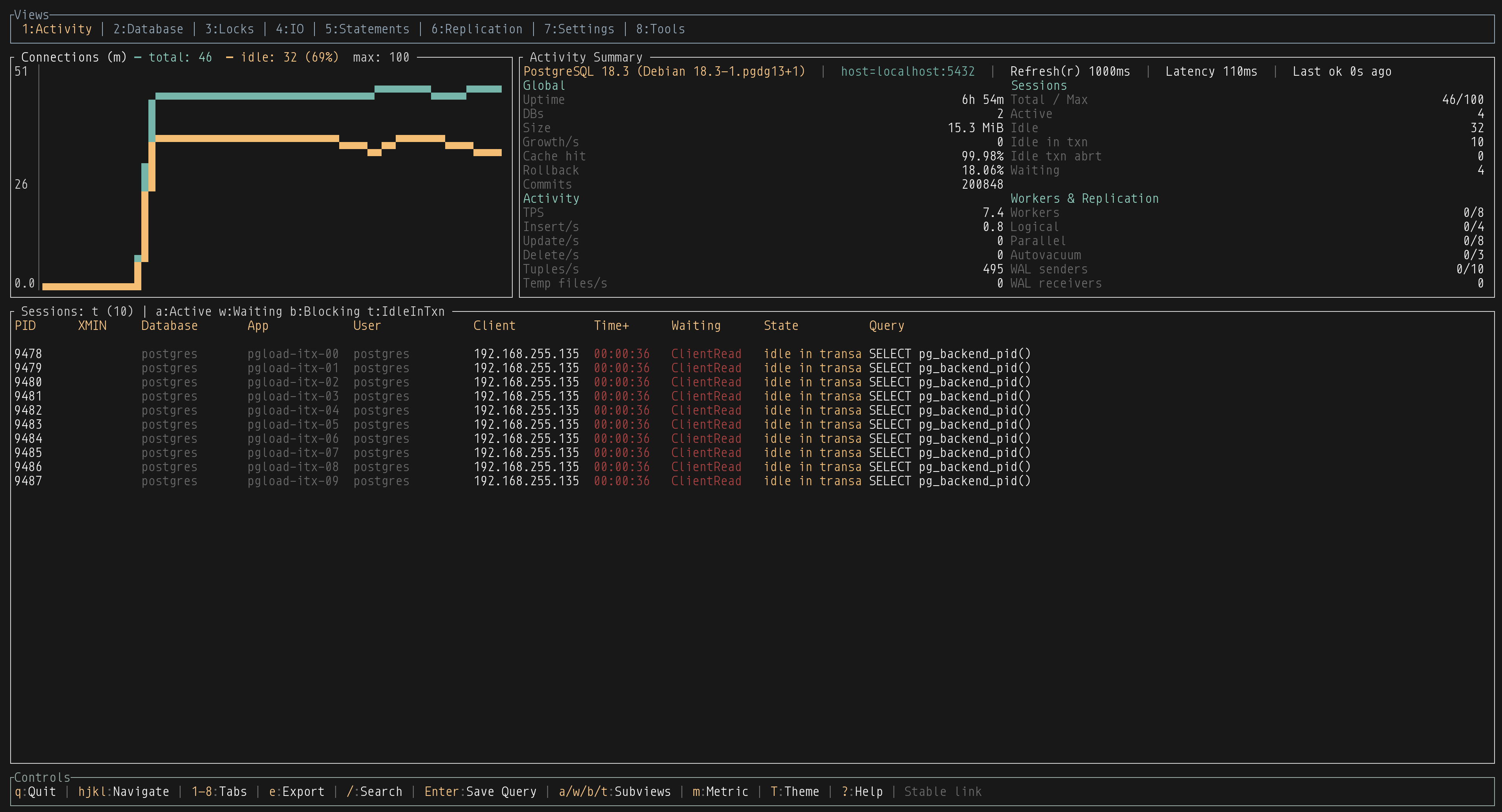 a,w,b, andtto switch between active, waiting, blocking, and idle-in-transaction session subviews. - In the Activity view, press