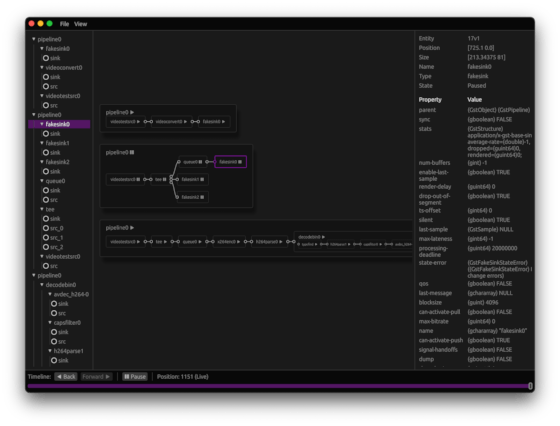 The app's data model is an ECS that should allow for maximum flexibility when used to view the content of different frameworks. The tracer embedded in the actual gstreamer program sends atomic updates to be performed on entities displayed by the app: an element is an entity with a node component, a name, a state etc. and once it reaches the app a size and a position can be added.