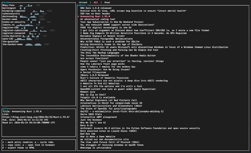 q/Esc- quit rss-tuihjkl/arrows - move up/down/left/right between feeds and entries, scroll up/down on an entryEnter- read selected entryr- refresh the selected feed (when feeds selected) or mark entry as read/unread (when entries selected)x- refresh all feedsi/e- change to insert mode (when feeds selected)e- email the current article (when viewing an entry; opens your default email client with the article title as subject and URL as body)a- toggle between read/unread entriesc- copy the selected link to the clipboard (feed or entry)o- open the selected link in your browser (feed or entry)d- delete the selected feed (with confirmation; pressdagain to confirm,nto cancel)E- export all feeds to an OPML file (saves to a timestamped file in your database directory)ctrl-u/ctrl-d- scroll up/down a page at a time