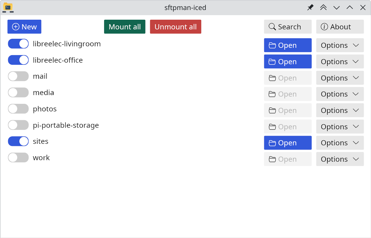 💡 Note: Installing the sftpman-iced GUI application will automatically pull the libsftpman library (provided by sftpman) as a dependency, but will not automatically install the sftpman CLI binary. If you'd like to use the sftpman CLI, install it separately.