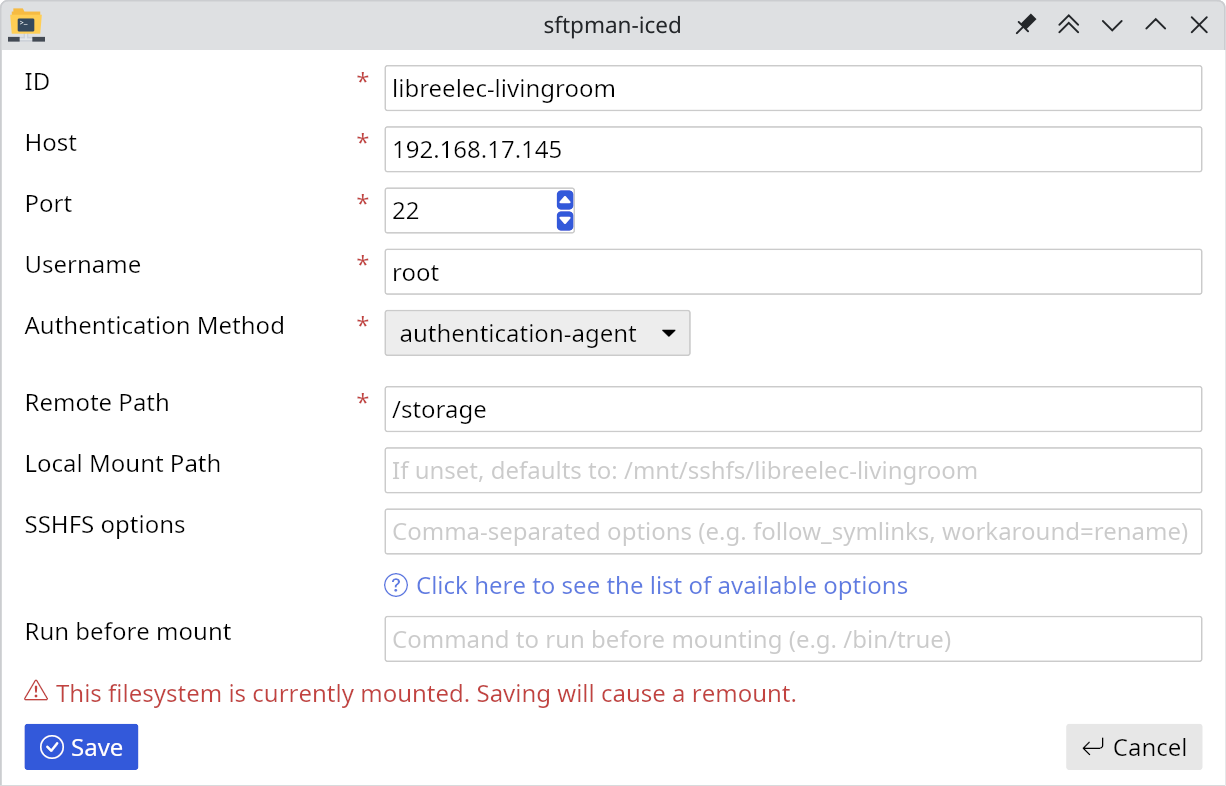 sftpman-iced is a GUI application for Linux systems that makes it easy to setup and mount sshfs/SFTP filesystems.
