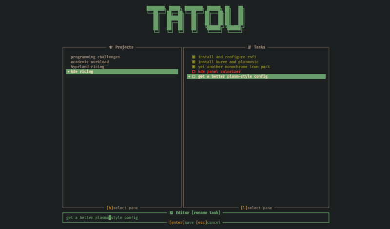 Tatou is a simple TUI application to manage and organize tasks. Tasks are grouped into projects. You can mark tasks as complete, edit existing tasks and projects, delete tasks as well as projects; all via intuitive keybindings.