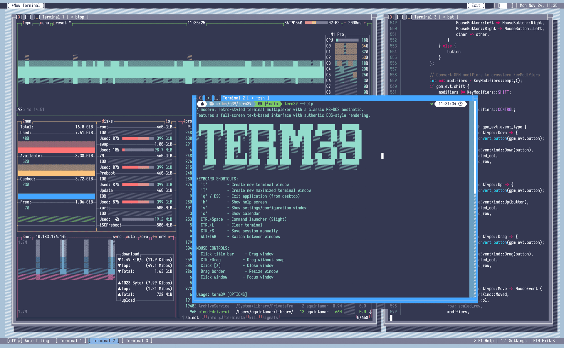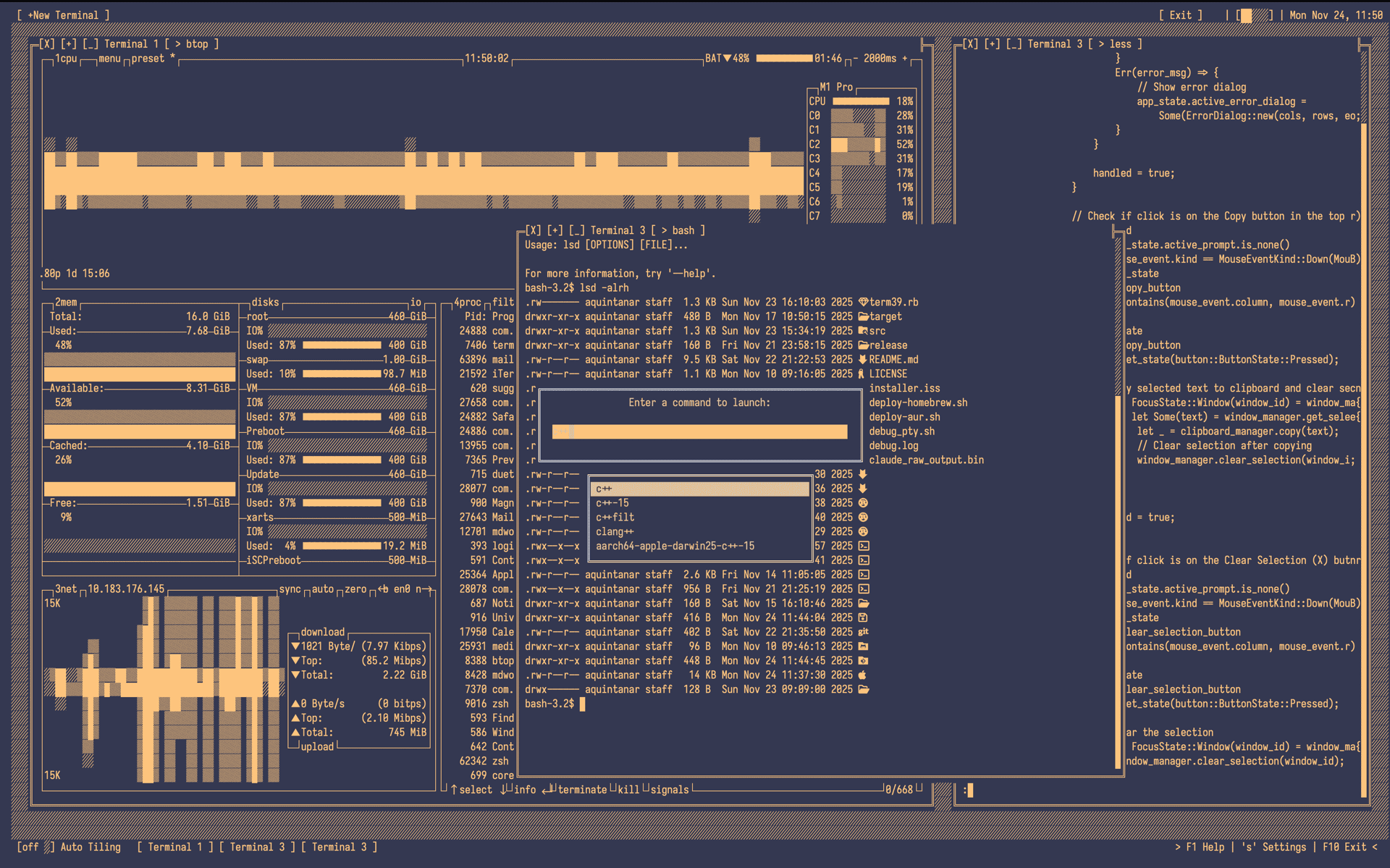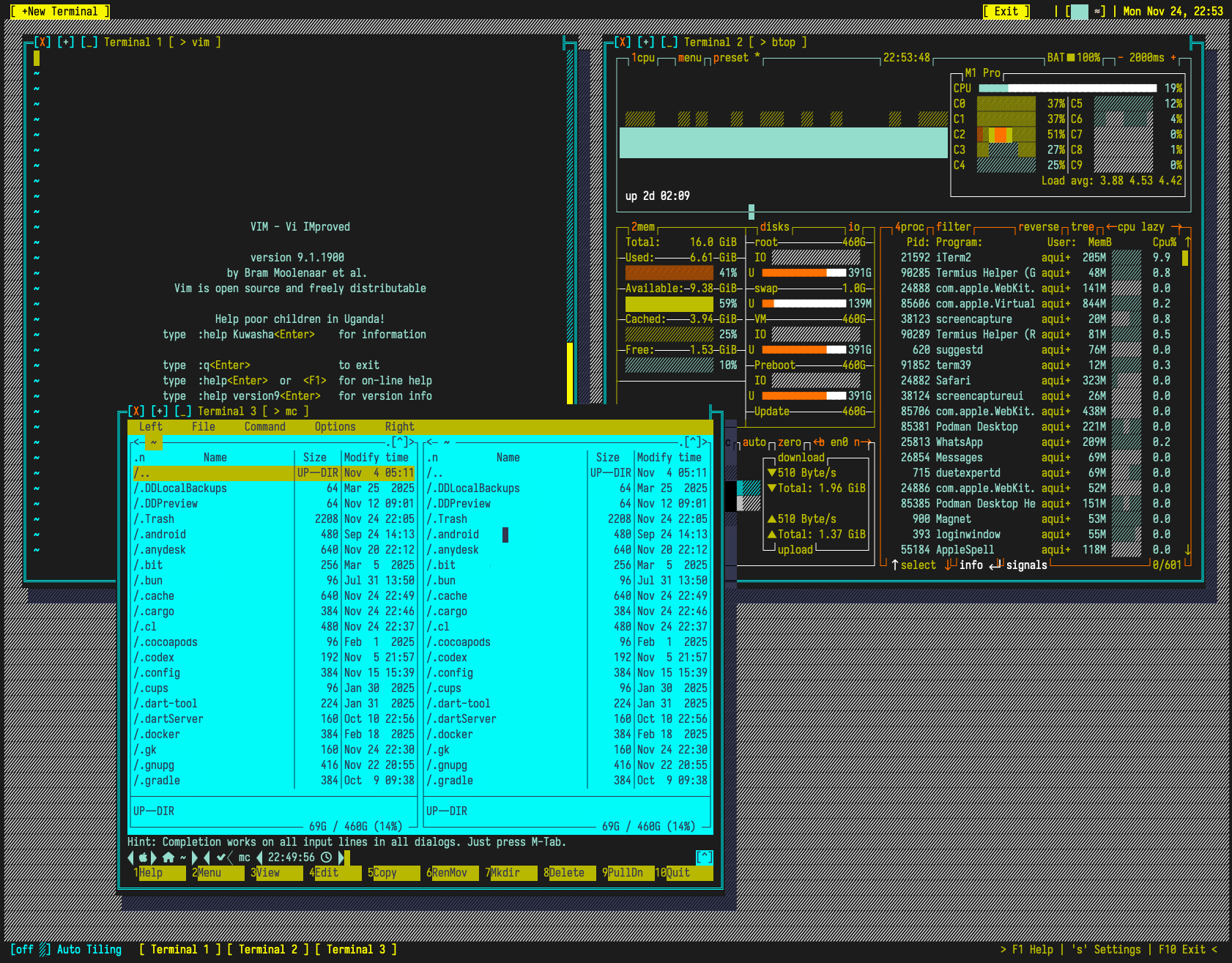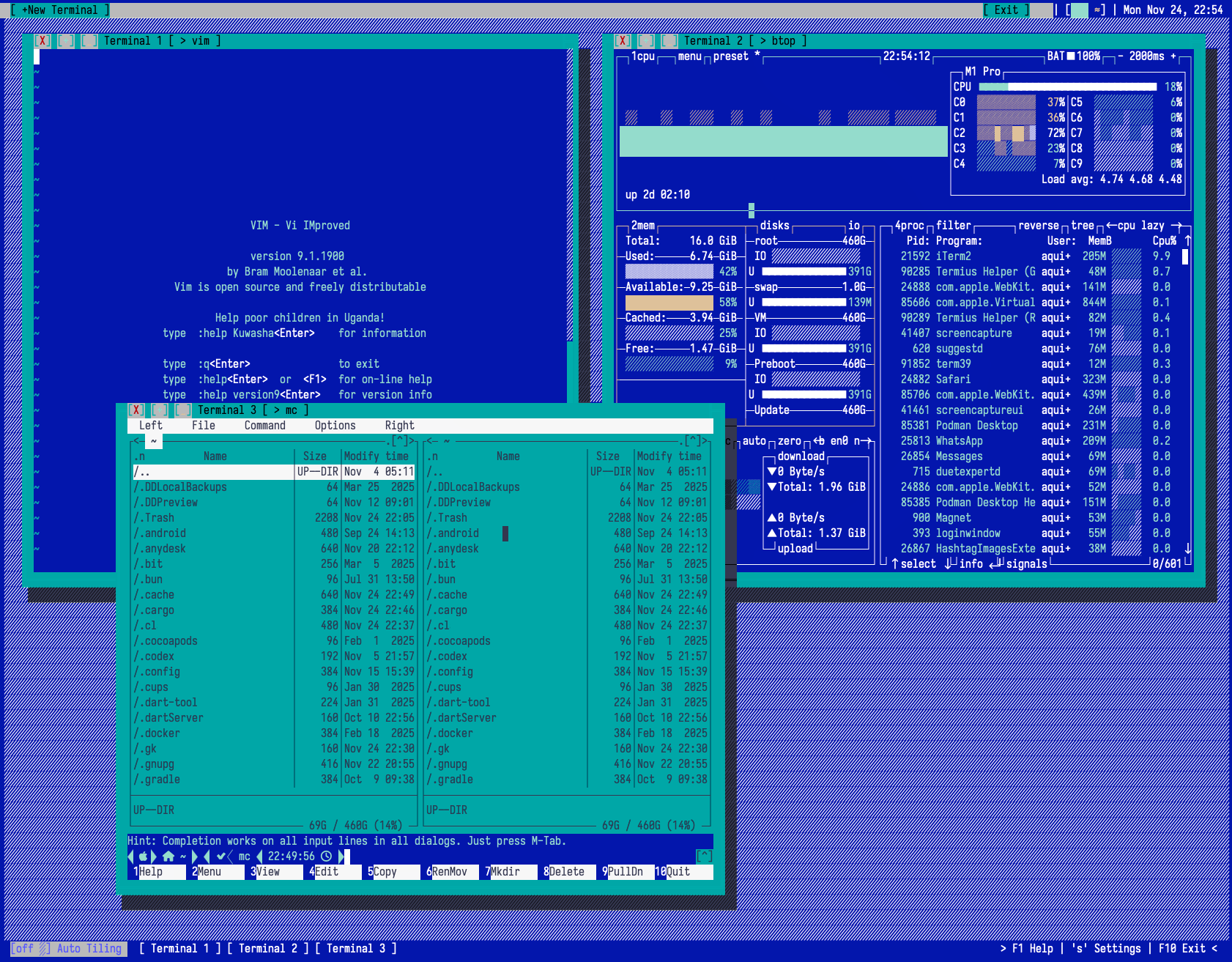 A modern terminal multiplexer with classic MS-DOS aesthetic, built with Rust. Full-screen interface with window management and complete terminal emulation. ( Linux / Windows / MacOS / Android-Termux )