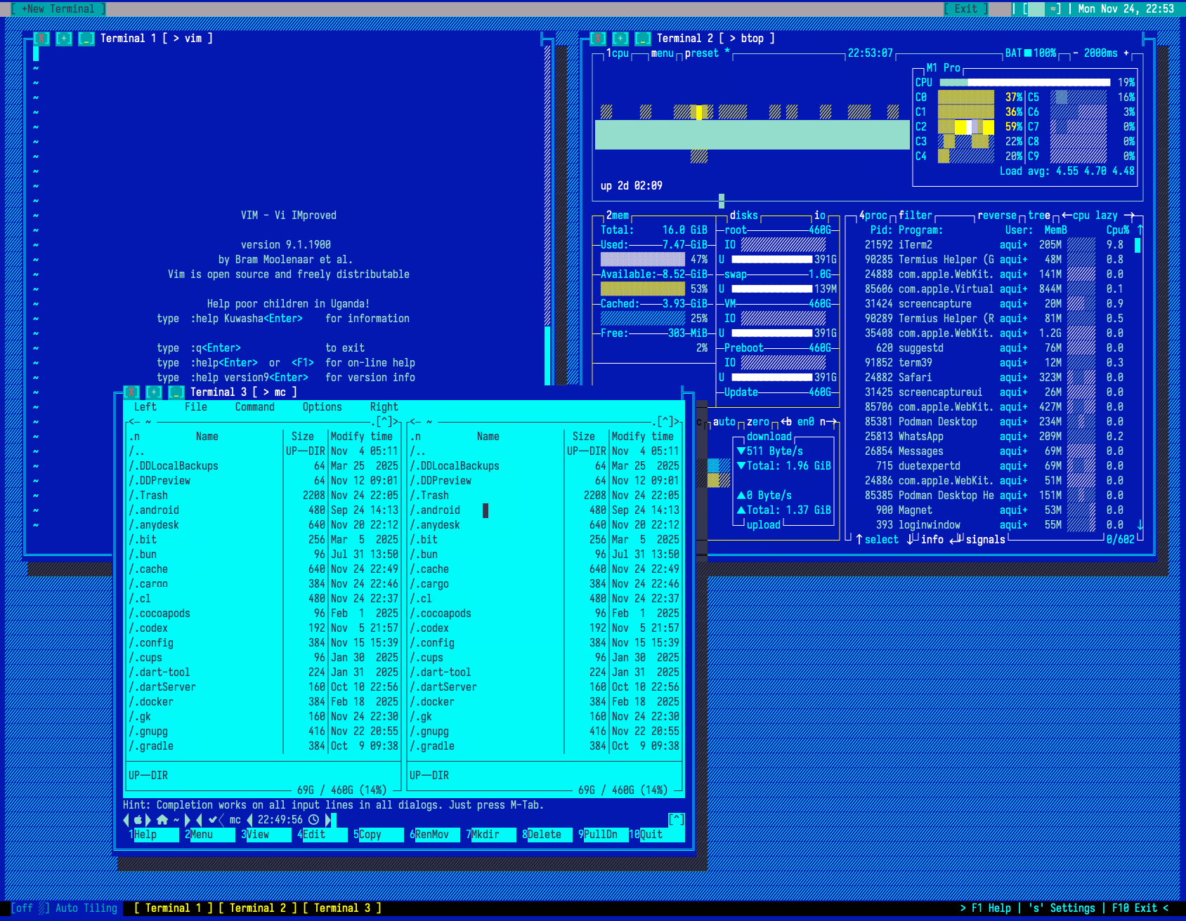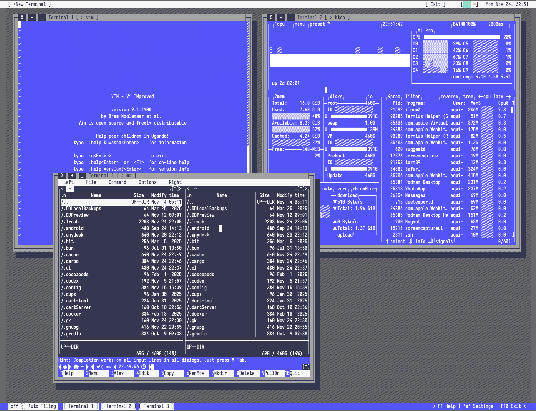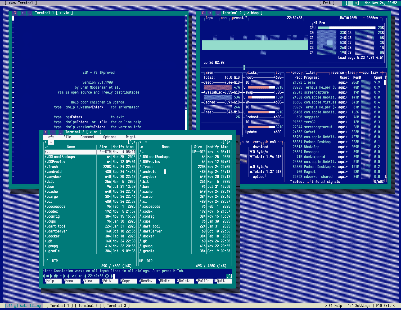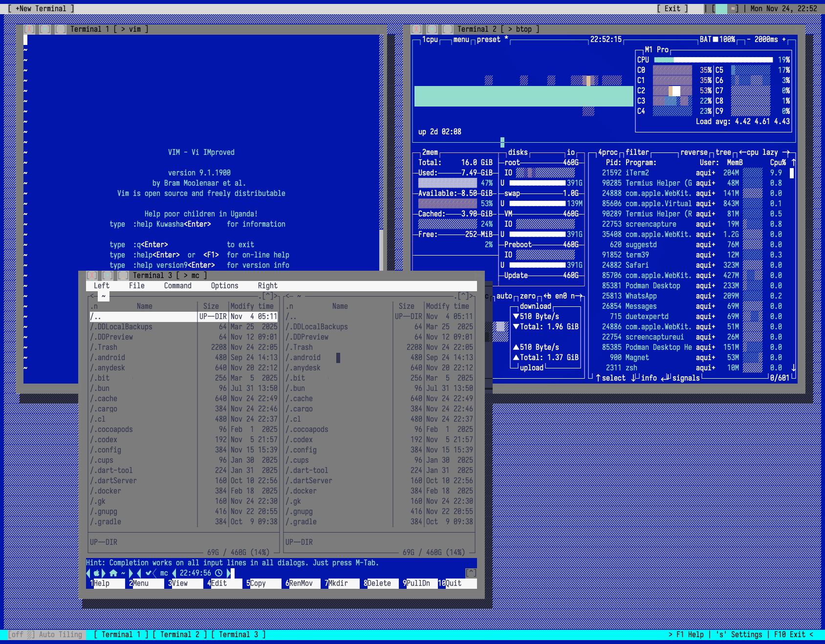A modern terminal multiplexer with classic MS-DOS aesthetic, built with Rust. Full-screen interface with window management and complete terminal emulation. ( Linux / Windows / MacOS / Android-Termux )