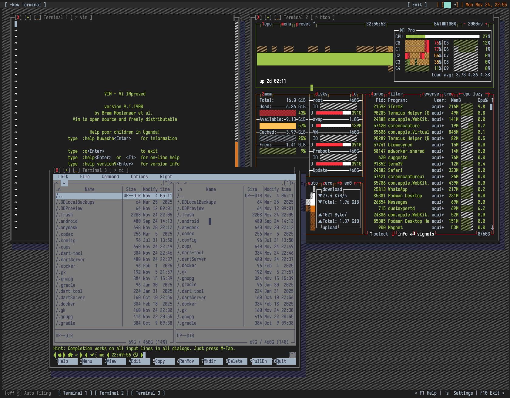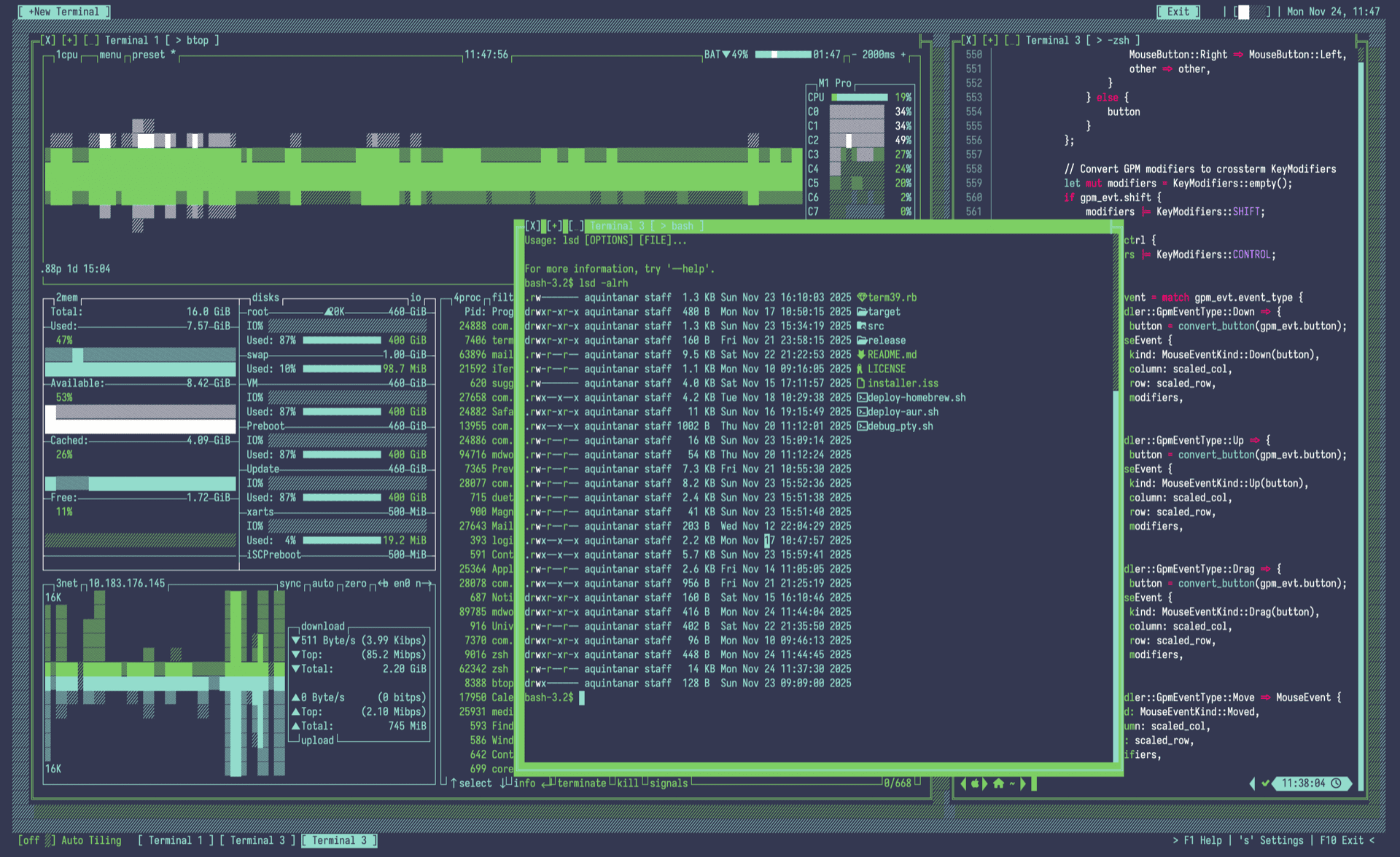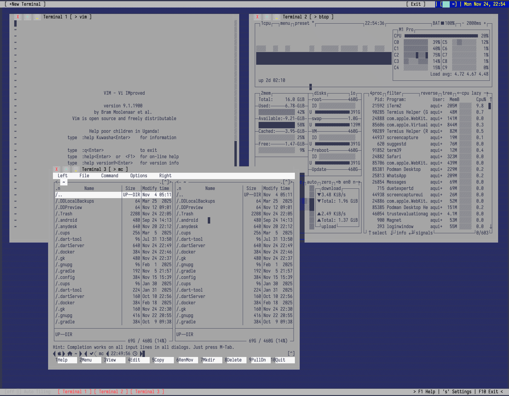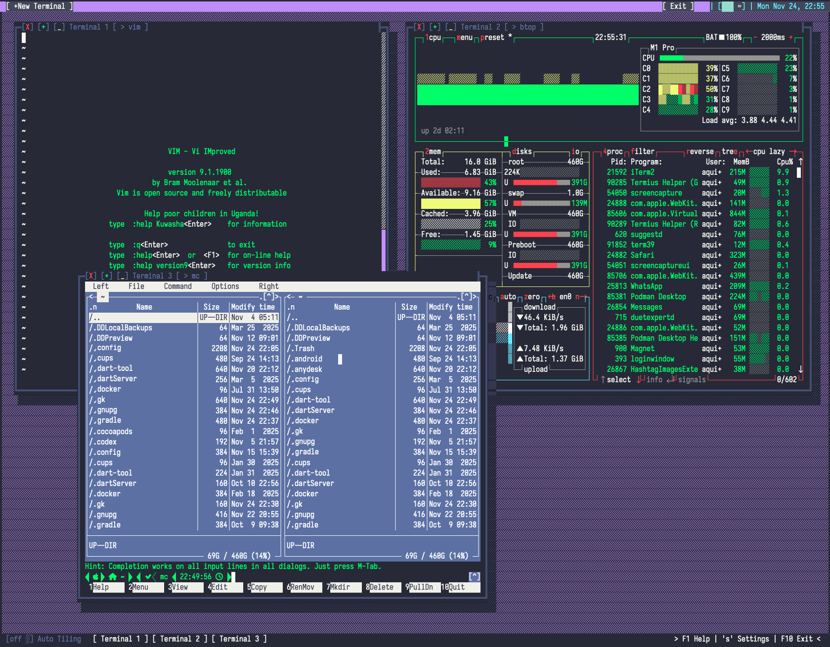 A modern terminal multiplexer with classic MS-DOS aesthetic, built with Rust. Full-screen interface with window management and complete terminal emulation. ( Linux / Windows / MacOS / Android-Termux )