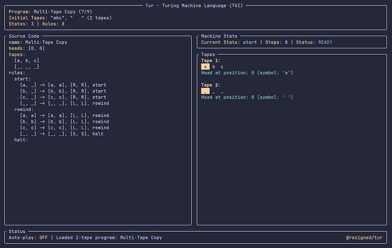 Tur (.tur files) provides a clean, readable syntax for defining both single-tape and multi-tape Turing machines. The language includes: